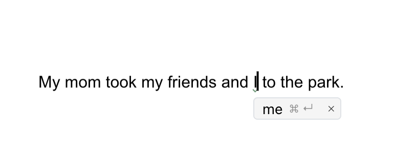If you type the same sentence in a Revise document, it will correctly suggest you change "I" to "me":